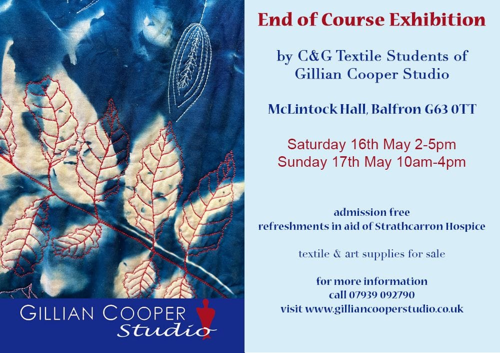 I am happy to report that I have now completed all the work for my City & Guilds Diploma in Patchwork and Quilting and I have great pleasure in inviting you to the final exhibition of work, where my sketchbooks and coursework will be on show. All the information is below: